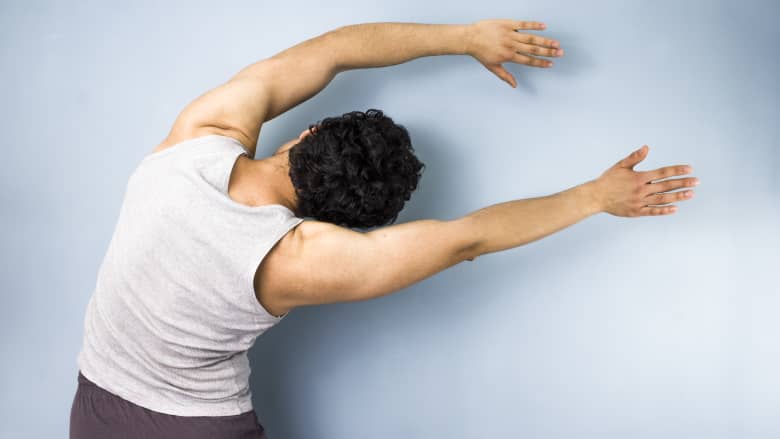 This stretch can help loosen and strengthen your lat muscles, which may feel tight due to scoliosis.